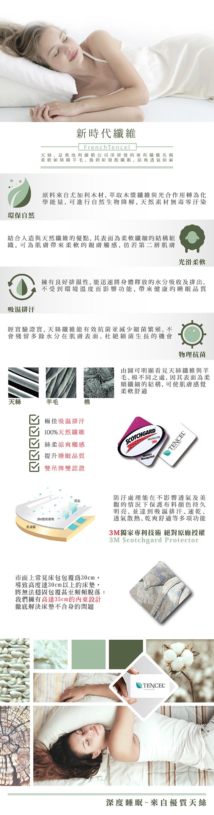 商品訊息簡述: 如第二層肌膚般的柔軟不易起毛球 獨家鋪棉兩用被做被頭AB版設計 獨家床包高度加高35公分 種類 床包類型 兩用被床包組規格 雙人加大主材質 天絲材質說明 表布 50 萊賽爾" />